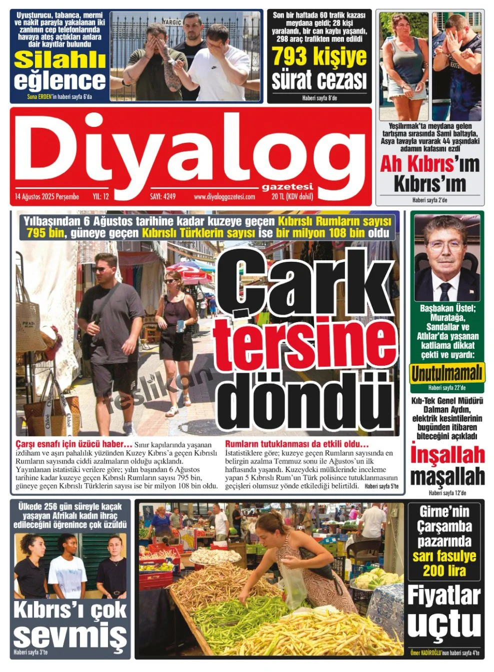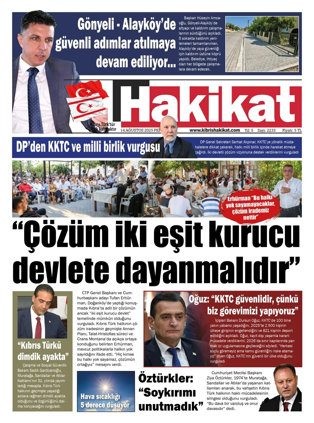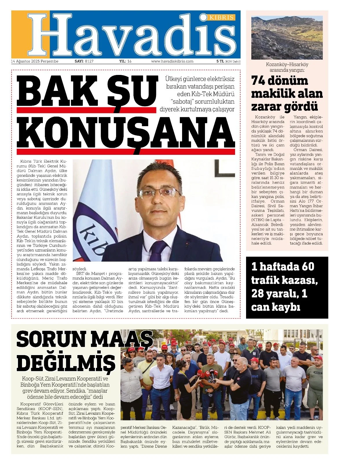 5 kişi ve şunu diyen bir yazı '508 SAS KIBRIS SU UYARISI! SENKUL'DAN VIZ düşmediği bugün 201 DAKİK Girno Belediyo Başkanı TAM Karaoglanogilbolgesinde Ozanko ütfen HABER mümku oiduğunca az kullanalım dedi. işimiz coccekte konusung I Depolanımiza yeteri kadar KIBRIS'TA FEDERAL CÖZUM DEFTERİ KAPANMIŞTIR! Dışişleri Bakanı Tahsin Ertuğruloğlu, federal çözüm defterinin bir daha acılmamak üzere kapandığınıi ifade ederek, ,Kıbrıslı Rumlarla ortak devlet kurup yaşatmanın mümkün olmadığını söyledi. gerçekc komşuluki iliskilori içerisinde egemen M clvsei vasip: par- koyması gerektial gerektigin vurguladı. Genel LTudanFrhür- agankoy KIBRIS'TA BARIS iKi DEVLETTEN madaKirista GECERI 'Ύ GİRİŞLERDE PARMAK iZi DÖNEMi BAŞLIYOR! İçişlori Bakanı Dursun odildiğini belirtti, Oguz, 0bine omelindomüm akın eyo' görseli olabilir4 kişi ve şunu diyen bir yazı 'Güröz: 'Grev devam edecek" Koop- Başkanı Bin- yazılı günü açıklama お公 tarafından LiçUncU reklamıyapılarak gibi ödenmiş veemekçi- lem- salabilmiştir. günlerdir durdu- yansıtılmışn devam Güröz, Koop Süt. Zirai Koopbank Güncel Persembe. Kıbris www.guncelkibris.com Agustos ELEKTRİK KESİNTİLERİ geçilmediğini sözle- rine ekledi. BUGUN BiTECEK ARAŞTIRIYORUZ SABOTAJ iHTİMALINİ Guiroz,4 yönündeki "Ceza yiyenler tabiki kamera ve denetime karşı çıkacak" Ulaştırma Arıklı, haftada genelinde Müdürü Tek) Genel diğinı, proje- kaynaklanma- bin 321ine yasanan ardındar kredi kapatıldığını açıkladı. ariza- 'Trafikte rallara uymayanlar YATIRIMLAR BORCLARIN tamamlanarak güç- veyoğun yana ARAŞTIRILIYOR ğmenkesintileri nemlirol oyna- dedi. yaklaşık belirtti. ariza yakalar okur seferinizv tanız ikonuşma- muayene döker gerekli cezaları dedi.' görseli olabilir1 kişi ve yazı görseli olabilir1 kişi ve şunu diyen bir yazı 'ZIRVEDEKIHABERINHMERKEZI HABE ZIRVEDE MERKEZI www.zirvekibris.com Y5 Sayı: 509 14Ağusto stos2025 Persembe ersembe ZIRVE KIBRIS Erhürman "Hiç kimse bu halkı yok sayamayacak" Cumhuriyetçi Türk Partisi (CTP) Ge- |Baskanı veC umhurbaşka Tufan Doğanköy' düzen- gördü. Girnelç Gime Başkani Senkul, Dikmer Reladive Belediye Baskanı Yüksel yelerinin rkesle aelece- dedi dışarıya Erhürman lmadığını, koparıl- diğını belirtti. Egemer parças bizimdirv soke alacağız" Erhürman, ษิท kararla- oplumlu, esitliğe dayalı federal yapı olduğunu hahrla' görseli olabilir2 kişi ve yazı görseli olabilir