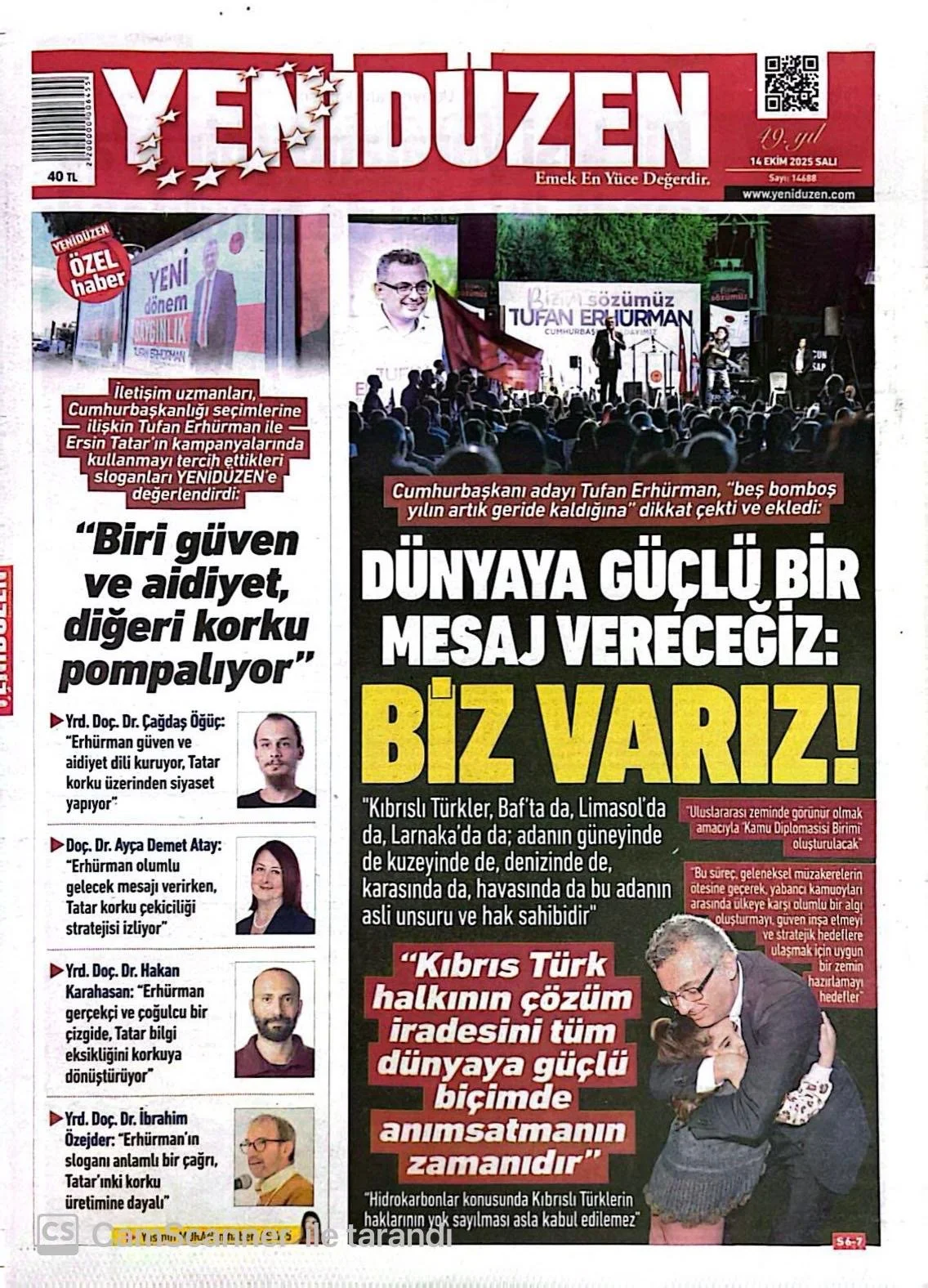şunu diyen bir yazı 'Kıbris Tarih: 14 Ekim 2025, Salı Sayı: 158 Yıl:1 fox bjektif www.kibrisobjektif.com ATATÜRK YALANI kadar büyük TATARDAN GIRNEDE; HODRİ MEYDAN rligından .Mitinglerd bayragıt ayragtaşmıyorlar" TÜZÜKLERİNDE FEDERASYON VAR foderasyon MoG geçiyoruz "dedi. iplamasi Cumhurbaşkanı bağımsız halka hitap ederek, Atatürk adayı Tatar, Girne'de düzenlenen anlattı etttim. celenk bırakarak mitinge başlayan Cumhurbaskani Tatar, Halkin samimiyetle ediyorum dedi. düğün cenazelere ygeziyor, seçilir. Halkın Kendi ailemiz tehdit edilmeyecek verecegimiz kuracagız. Malımız elimizdena Rum'un masasına kurban dedi. Tatar, Kıbris Türk halkının kendi YILLARCA DENENMİŞ FEDERASYON MODELLERİ TÜKENDİ mücadele ettiğini federasyon Tatar, dedi. neKarpaz'dan, Lapta'da aptadan, radaric Girne'der vazgeçeriz. Hodrir meydan, olan gelsino de bakalım" dedi.' görseli olabiliryazı görseli olabiliryazı görseli olabilir