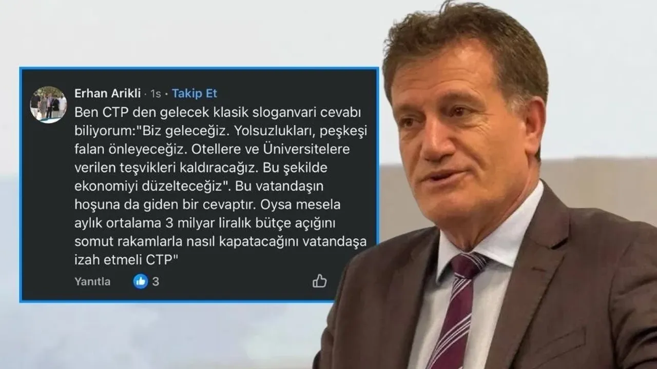 Arıklı, CTP’den gelecek yanıtların öngörülebilir olduğunu savunarak, “Ben CTP’den gelecek klasik sloganvari cevabı biliyorum: ‘Biz geleceğiz. Yolsuzlukları, peşkeşi önleyeceğiz. Otellere ve üniversitelere verilen teşvikleri kaldıracağız. Bu şekilde ekonomiyi düzelteceğiz’” ifadelerini kullandı.
